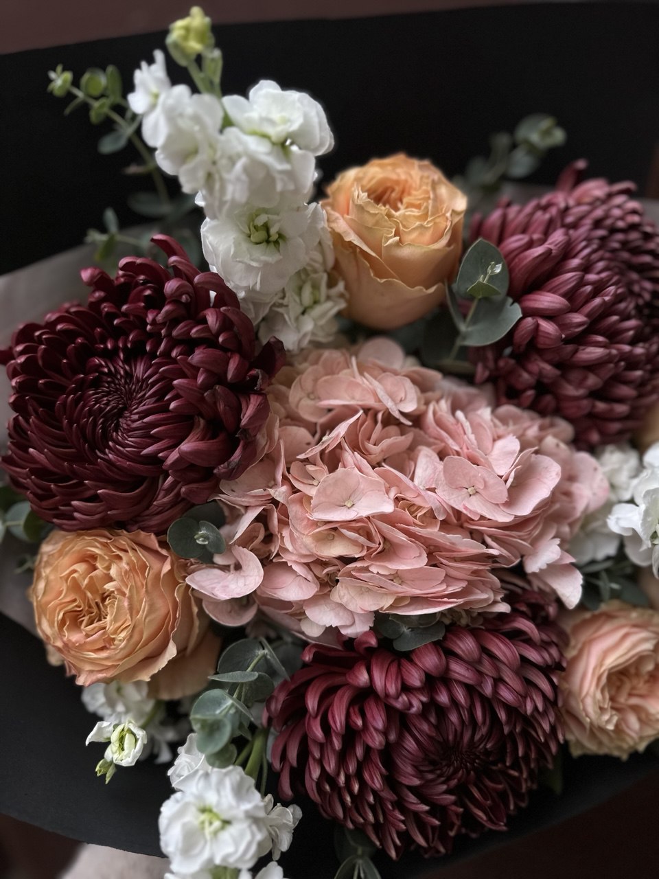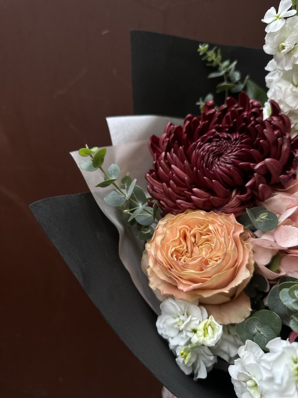 Насыщенные бордовые хризантемы — символ тепла и уюта в прохладные осенние дни. Этот букет идеально передаёт настроение сезона: глубокие оттенки, мягкие линии и природная гармония.